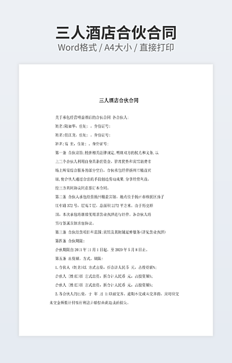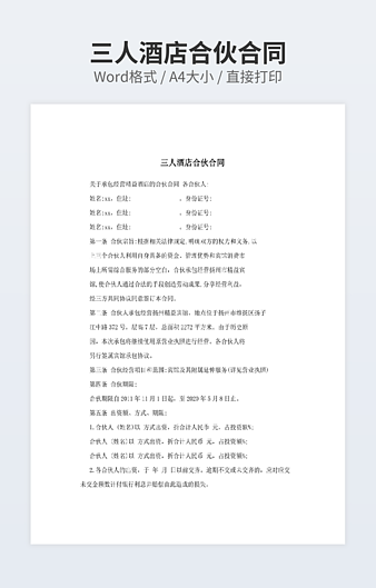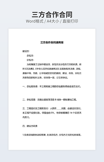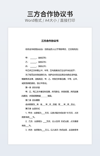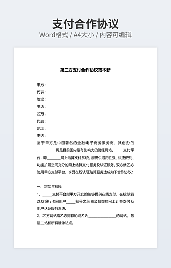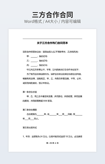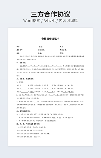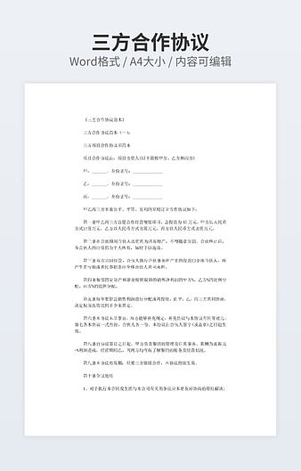 本作品内容为市场合作推广协议-第三方下载,大小为17.23KB,作品为高清大图模板,格式为docx, 属于多人合作模板,作品模板源文件下载后可用编辑替换,模板中如有人物画像仅供参考禁止商用。小Q办公网-提供简历,PPT,Word,Excel优质模板素材下载模版平台,拥有海量的工作总结、竞聘求职、年终颁奖、计划书等。 通过小Q办公网下载多人合作模板源文件编辑修改源文件文字和图片即可使用。