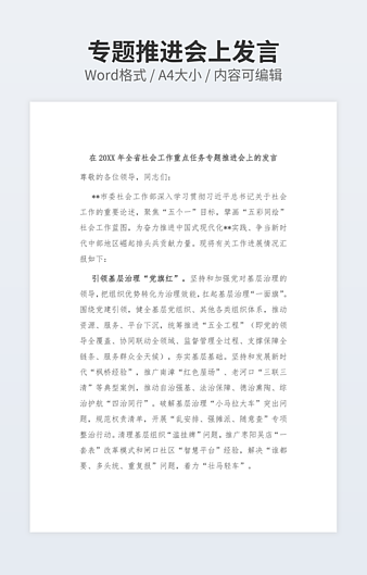 【特殊限制】设计师仅对作品中独创性部分享有著作权,对作品中含有的国旗、国徽等政治图案不享有权利,仅作为作品整体效果的示例展示,禁止商用。 相关关键词: 防汛 减灾 地质 灾害 防范 应对 工作 工作会 会上 讲话