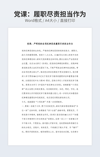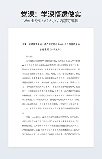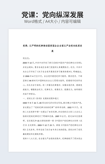 本作品内容为党课:学党纪明规矩守初心担使命为公司高质量发展提供坚强纪律保障下载,大小为17.09KB,作品为高清大图模板,格式为docx, 属于党课培训模板,作品模板源文件下载后可用编辑替换,模板中如有人物画像仅供参考禁止商用。小Q办公网-提供简历,PPT,Word,Excel优质模板素材下载模版平台,拥有海量的工作总结、竞聘求职、年终颁奖、计划书等。 通过小Q办公网下载党课培训模板源文件编辑修改源文件文字和图片即可使用。