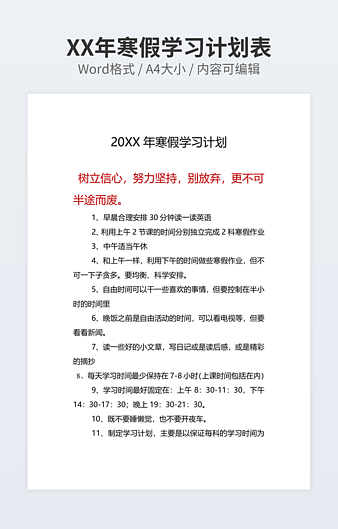 【特殊限制】设计师仅对作品中独创性部分享有著作权,对作品中含有的国旗、国徽等政治图案不享有权利,仅作为作品整体效果的示例展示,禁止商用。 相关关键词: 寒假 学习计划