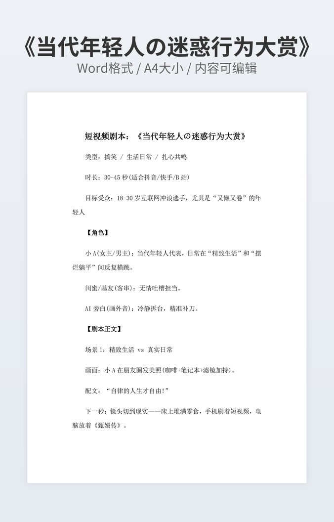 本作品内容为《当代年轻人精神状态一览》下载,大小为12.25KB,作品为高清大图模板,格式为docx, 属于脚本剧本模板,作品模板源文件下载后可用编辑替换,模板中如有人物画像仅供参考禁止商用。小Q办公网-提供简历,PPT,Word,Excel优质模板素材下载模版平台,拥有海量的工作总结、竞聘求职、年终颁奖、计划书等。 通过小Q办公网下载脚本剧本模板源文件编辑修改源文件文字和图片即可使用。
