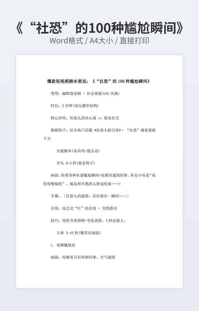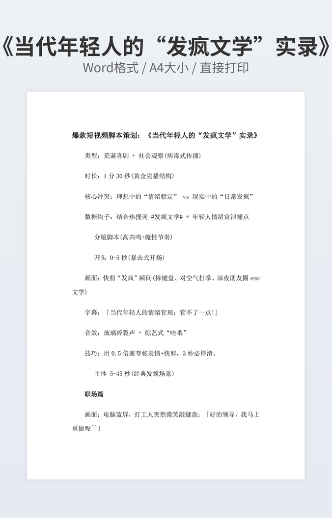 本作品内容为《当代打工人的“电子木鱼”》下载,大小为12.13KB,作品为高清大图模板,格式为docx, 属于脚本剧本模板,作品模板源文件下载后可用编辑替换,模板中如有人物画像仅供参考禁止商用。小Q办公网-提供简历,PPT,Word,Excel优质模板素材下载模版平台,拥有海量的工作总结、竞聘求职、年终颁奖、计划书等。 通过小Q办公网下载脚本剧本模板源文件编辑修改源文件文字和图片即可使用。