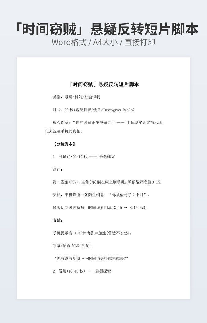 本作品内容为《时间旅行者》拍摄脚本下载,大小为13.64KB,作品为高清大图模板,格式为docx, 属于脚本剧本模板,作品模板源文件下载后可用编辑替换,模板中如有人物画像仅供参考禁止商用。小Q办公网-提供简历,PPT,Word,Excel优质模板素材下载模版平台,拥有海量的工作总结、竞聘求职、年终颁奖、计划书等。 通过小Q办公网下载脚本剧本模板源文件编辑修改源文件文字和图片即可使用。