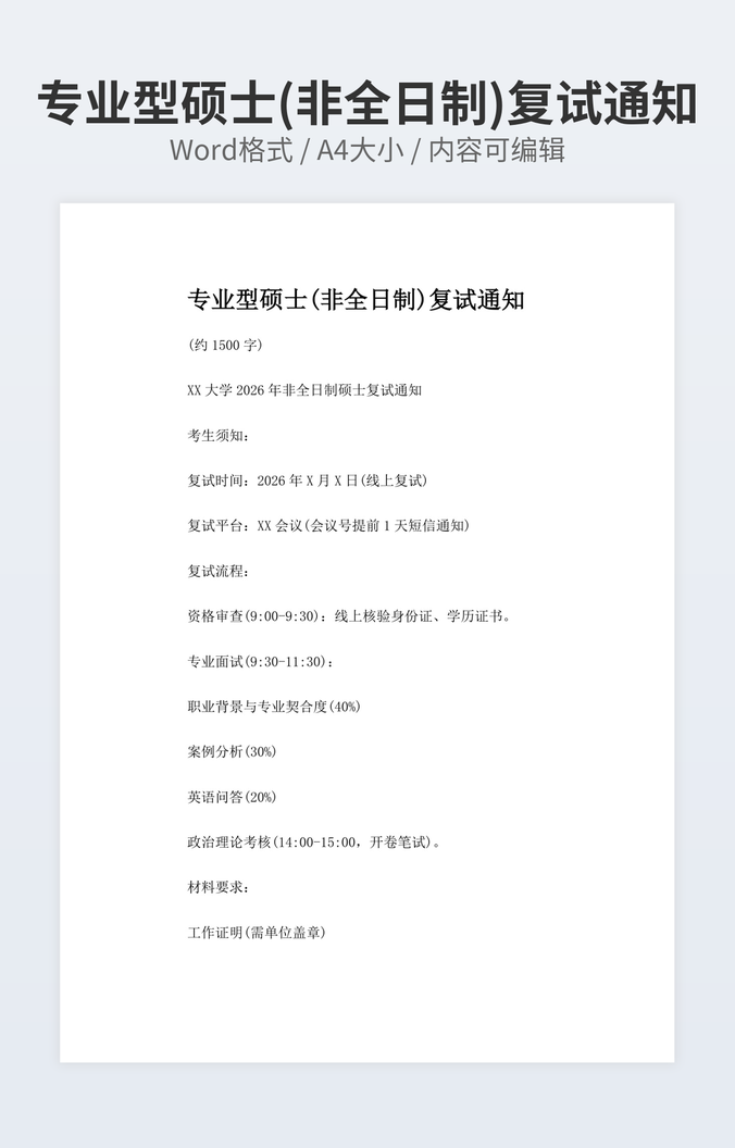 【特殊限制】设计师仅对作品中独创性部分享有著作权,对作品中含有的国旗、国徽等政治图案不享有权利,仅作为作品整体效果的示例展示,禁止商用。 相关关键词: 学术型 硕士 复试 通知书