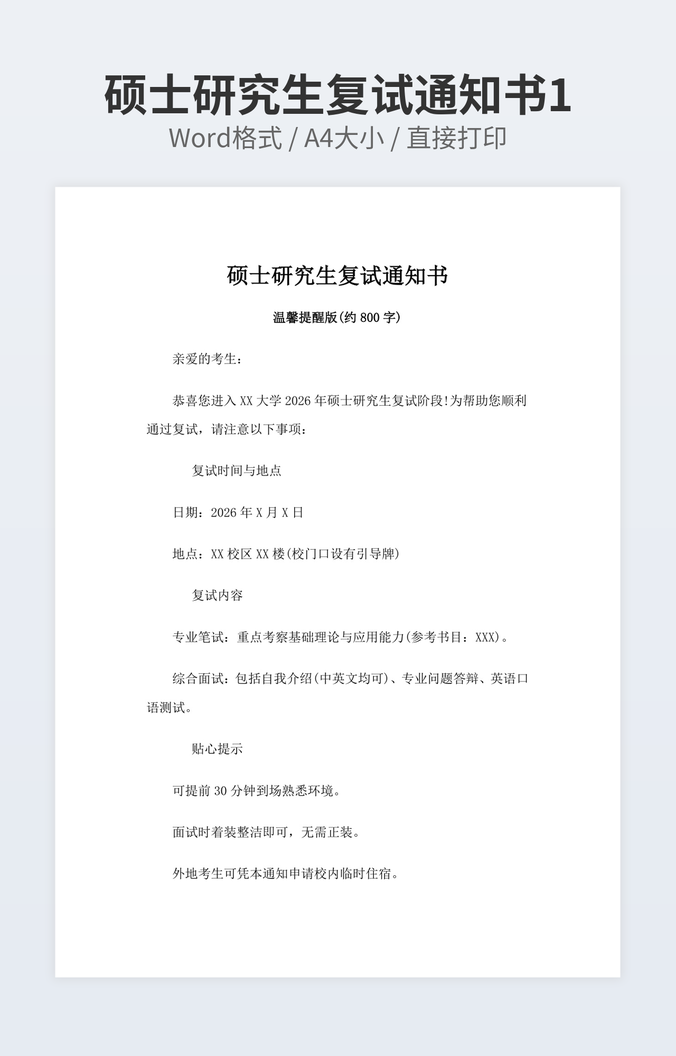 本作品内容为学术型硕士复试通知书下载,大小为12.02KB,作品为高清大图模板,格式为docx, 属于复试通知书模板,作品模板源文件下载后可用编辑替换,模板中如有人物画像仅供参考禁止商用。小Q办公网-提供简历,PPT,Word,Excel优质模板素材下载模版平台,拥有海量的工作总结、竞聘求职、年终颁奖、计划书等。 通过小Q办公网下载复试通知书模板源文件编辑修改源文件文字和图片即可使用。