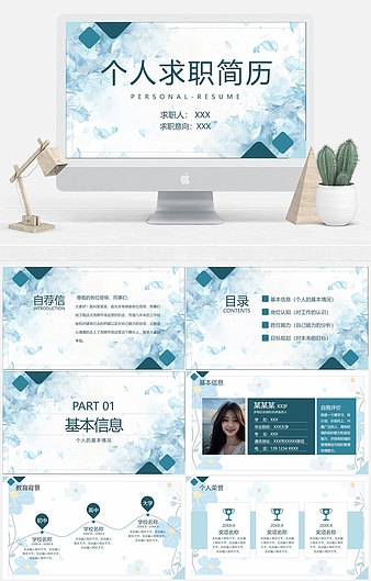 【特殊限制】设计师仅对作品中独创性部分享有著作权,对作品中含有的国旗、国徽等政治图案不享有权利,仅作为作品整体效果的示例展示,禁止商用。 相关关键词: 蓝色 简约 几何 个人 简历 介绍 竞聘 述职 企业
