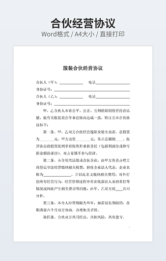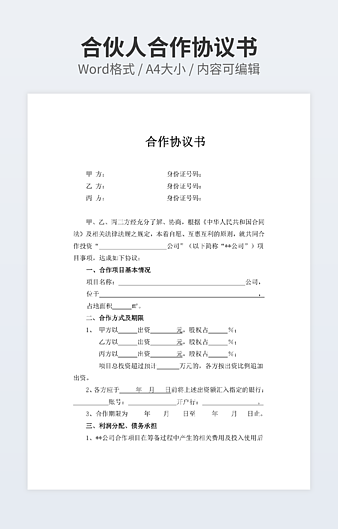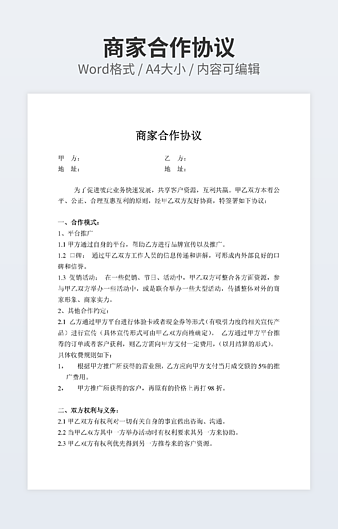 本作品内容为连锁合作协议下载,大小为23.02KB,作品为高清大图模板,格式为doc, 属于合伙协议模板,作品模板源文件下载后可用编辑替换,模板中如有人物画像仅供参考禁止商用。小Q办公网-提供简历,PPT,Word,Excel优质模板素材下载模版平台,拥有海量的工作总结、竞聘求职、年终颁奖、计划书等。 通过小Q办公网下载合伙协议模板源文件编辑修改源文件文字和图片即可使用。