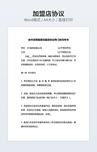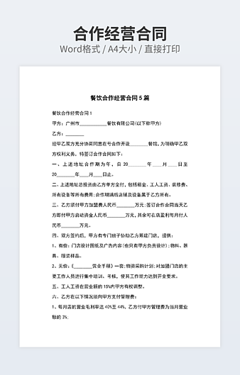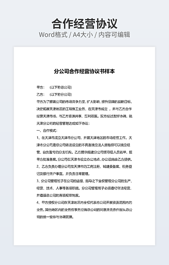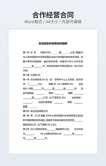 本作品内容为合法的合作经营合同范本下载,大小为21.67KB,作品为高清大图模板,格式为docx, 属于经营合作模板,作品模板源文件下载后可用编辑替换,模板中如有人物画像仅供参考禁止商用。小Q办公网-提供简历,PPT,Word,Excel优质模板素材下载模版平台,拥有海量的工作总结、竞聘求职、年终颁奖、计划书等。 通过小Q办公网下载经营合作模板源文件编辑修改源文件文字和图片即可使用。