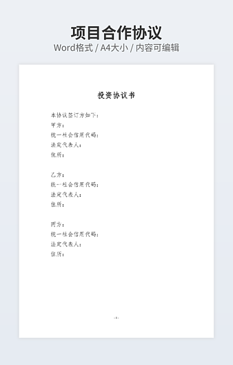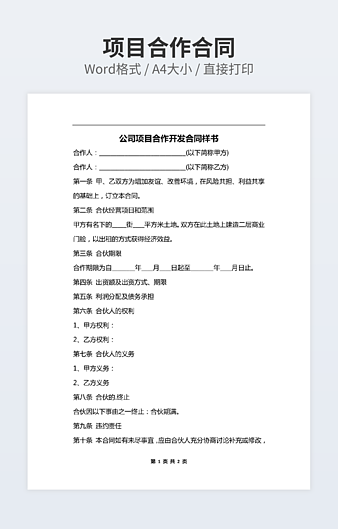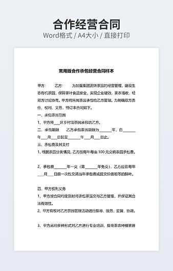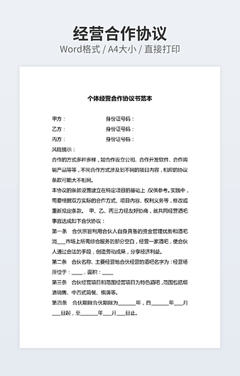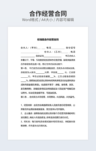 【特殊限制】设计师仅对作品中独创性部分享有著作权,对作品中含有的国旗、国徽等政治图案不享有权利,仅作为作品整体效果的示例展示,禁止商用。 相关关键词: 常用 合作经营 合同 模板