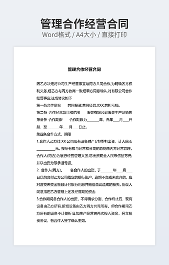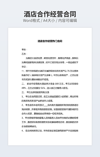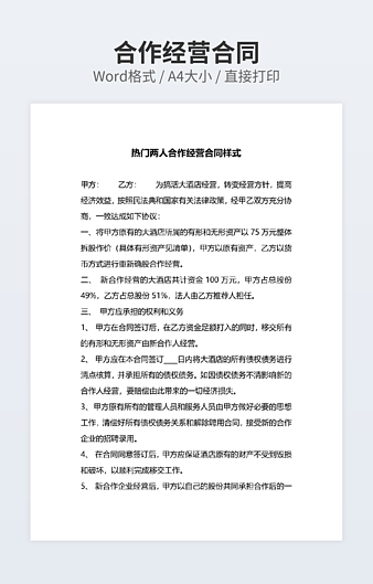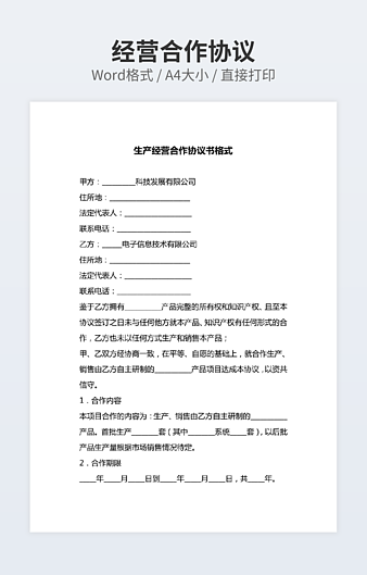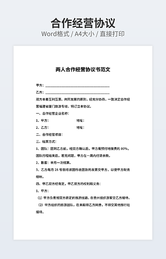 本作品内容为常用版合作经营合同模板下载,大小为14KB,作品为高清大图模板,格式为docx, 属于经营合作模板,作品模板源文件下载后可用编辑替换,模板中如有人物画像仅供参考禁止商用。小Q办公网-提供简历,PPT,Word,Excel优质模板素材下载模版平台,拥有海量的工作总结、竞聘求职、年终颁奖、计划书等。 通过小Q办公网下载经营合作模板源文件编辑修改源文件文字和图片即可使用。