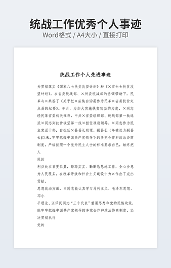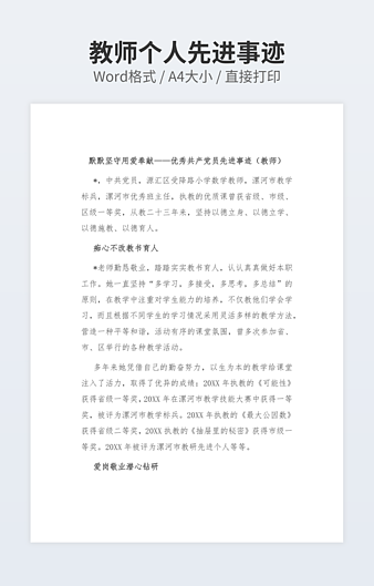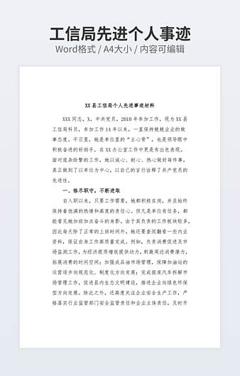 本作品内容为X同志先进事迹下载,大小为16.39KB,作品为高清大图模板,格式为docx, 属于先进事迹模板,作品模板源文件下载后可用编辑替换,模板中如有人物画像仅供参考禁止商用。小Q办公网-提供简历,PPT,Word,Excel优质模板素材下载模版平台,拥有海量的工作总结、竞聘求职、年终颁奖、计划书等。 通过小Q办公网下载先进事迹模板源文件编辑修改源文件文字和图片即可使用。