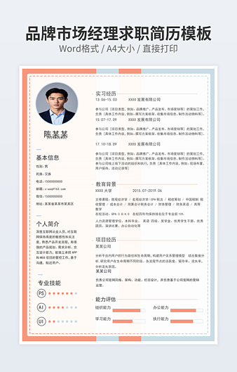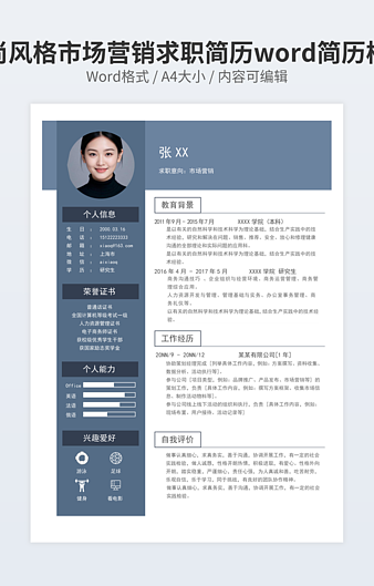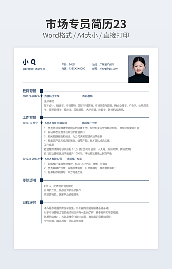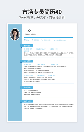 本作品内容为市场推广专员简历下载,大小为586.18KB,作品为高清大图模板,格式为docx, 属于市场营销模板,作品模板源文件下载后可用编辑替换,模板中如有人物画像仅供参考禁止商用。小Q办公网-提供简历,PPT,Word,Excel优质模板素材下载模版平台,拥有海量的工作总结、竞聘求职、年终颁奖、计划书等。 通过小Q办公网下载市场营销模板源文件编辑修改源文件文字和图片即可使用。