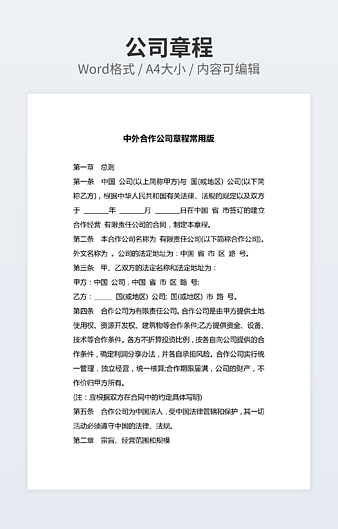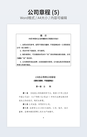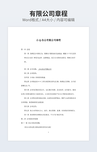 【特殊限制】设计师仅对作品中独创性部分享有著作权,对作品中含有的国旗、国徽等政治图案不享有权利,仅作为作品整体效果的示例展示,禁止商用。 相关关键词: 公司 章程 经典 范本