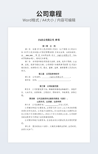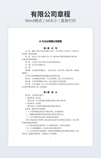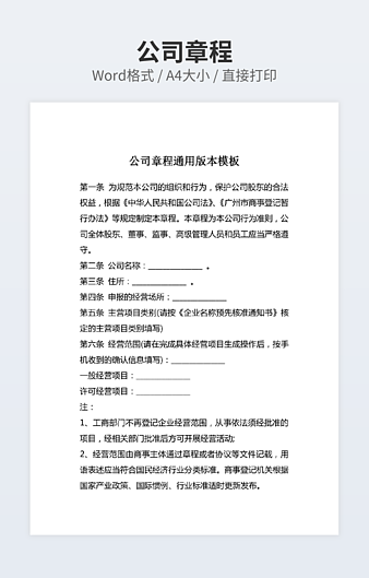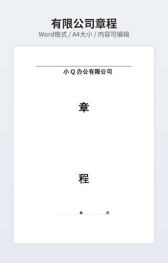 【特殊限制】设计师仅对作品中独创性部分享有著作权,对作品中含有的国旗、国徽等政治图案不享有权利,仅作为作品整体效果的示例展示,禁止商用。 相关关键词: 公司 章程 范本