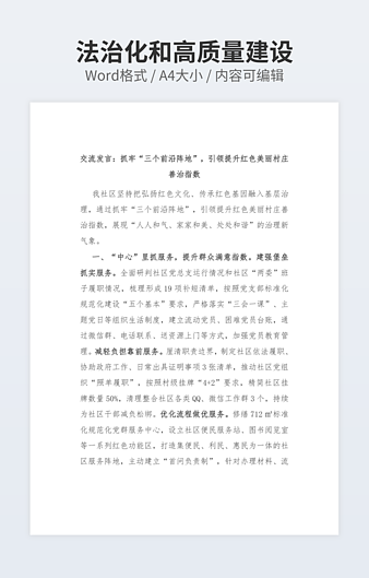 本作品内容为社会基层治理工作交流下载,大小为12.81KB,作品为高清大图模板,格式为docx, 属于经验交流模板,作品模板源文件下载后可用编辑替换,模板中如有人物画像仅供参考禁止商用。小Q办公网-提供简历,PPT,Word,Excel优质模板素材下载模版平台,拥有海量的工作总结、竞聘求职、年终颁奖、计划书等。 通过小Q办公网下载经验交流模板源文件编辑修改源文件文字和图片即可使用。