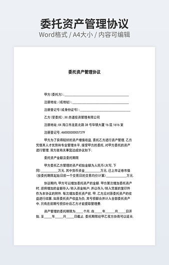 本作品内容为证券资产委托管理合同下载,大小为21.2KB,作品为高清大图模板,格式为docx, 属于资产管理模板,作品模板源文件下载后可用编辑替换,模板中如有人物画像仅供参考禁止商用。小Q办公网-提供简历,PPT,Word,Excel优质模板素材下载模版平台,拥有海量的工作总结、竞聘求职、年终颁奖、计划书等。 通过小Q办公网下载资产管理模板源文件编辑修改源文件文字和图片即可使用。