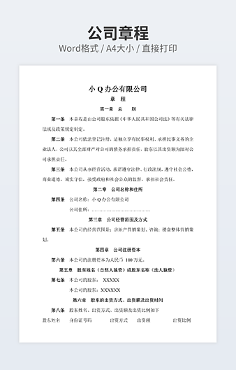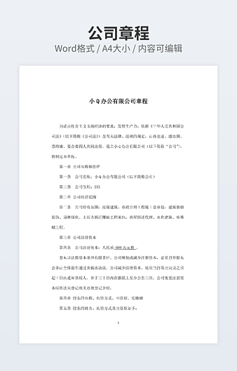 本作品内容为通用版公司章程下载,大小为21.06KB,作品为高清大图模板,格式为docx, 属于公司章程 模板,作品模板源文件下载后可用编辑替换,模板中如有人物画像仅供参考禁止商用。小Q办公网-提供简历,PPT,Word,Excel优质模板素材下载模版平台,拥有海量的工作总结、竞聘求职、年终颁奖、计划书等。 通过小Q办公网下载公司章程 模板源文件编辑修改源文件文字和图片即可使用。