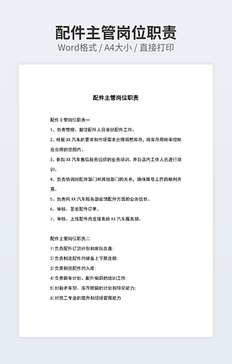 本作品内容为工程部岗位职责下载,大小为19.8KB,作品为高清大图模板,格式为docx, 属于岗位说明书模板,作品模板源文件下载后可用编辑替换,模板中如有人物画像仅供参考禁止商用。小Q办公网-提供简历,PPT,Word,Excel优质模板素材下载模版平台,拥有海量的工作总结、竞聘求职、年终颁奖、计划书等。 通过小Q办公网下载岗位说明书模板源文件编辑修改源文件文字和图片即可使用。