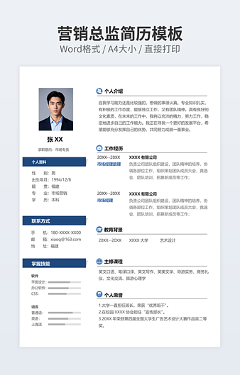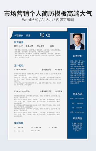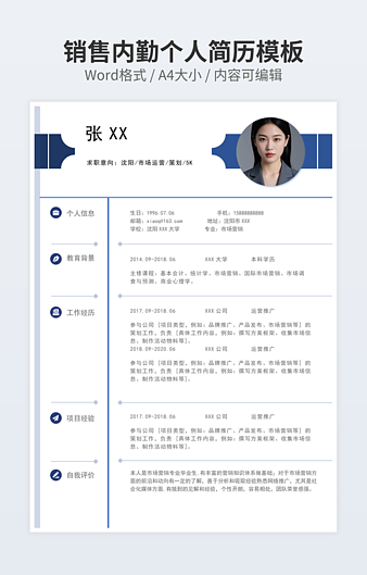 本作品内容为销售员简历下载,大小为137.75KB,作品为高清大图模板,格式为docx, 属于市场营销模板,作品模板源文件下载后可用编辑替换,模板中如有人物画像仅供参考禁止商用。小Q办公网-提供简历,PPT,Word,Excel优质模板素材下载模版平台,拥有海量的工作总结、竞聘求职、年终颁奖、计划书等。 通过小Q办公网下载市场营销模板源文件编辑修改源文件文字和图片即可使用。