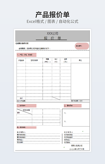 【特殊限制】设计师仅对作品中独创性部分享有著作权,对作品中含有的国旗、国徽等政治图案不享有权利,仅作为作品整体效果的示例展示,禁止商用。 相关关键词: 图片 介绍 产品 产品报价 报价单 Excel 模板 优秀